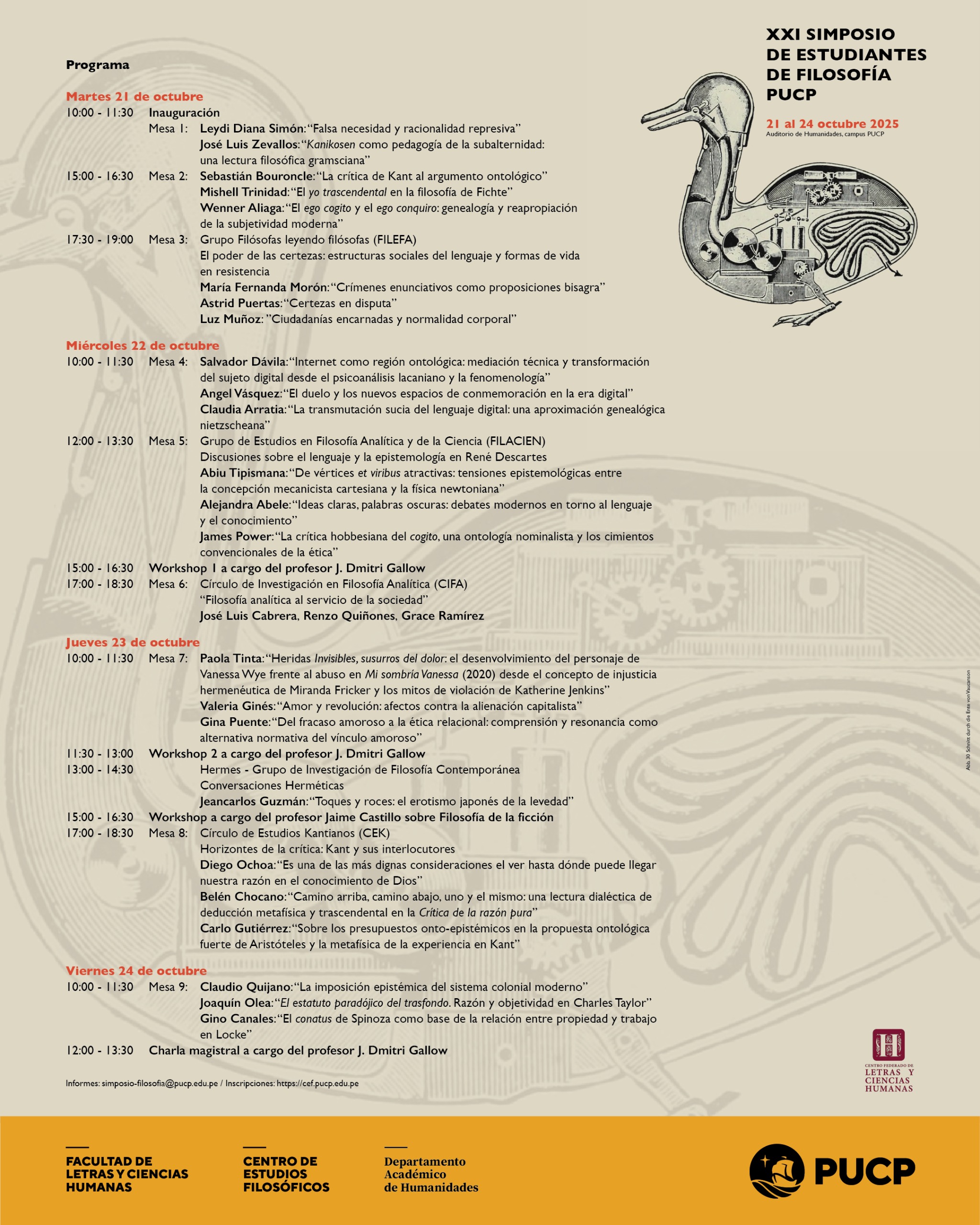 La Facultad de Letras y Ciencias Humanas, el Departamento Académico de Humanidades, el Centro de Estudios Filosóficos y los estudiantes de filosofía de la Pontificia Universidad Católica del Perú organizan el XXI Simposio de Estudiantes de Filosofía, que se llevará a cabo del 21 al 24 de octubre de 2025, en el Auditorio de Humanidades de la PUCP.